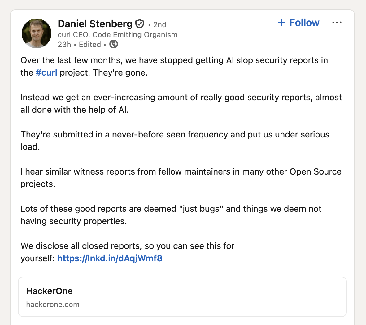 However, in a post on Linkedin on April 6th 2026, Daniel posted the following “Over the last few months, we have stopped getting AI slop security reports” and “Instead we get an ever-increasing amount of really good security reports, almost all done with the help of AI.”